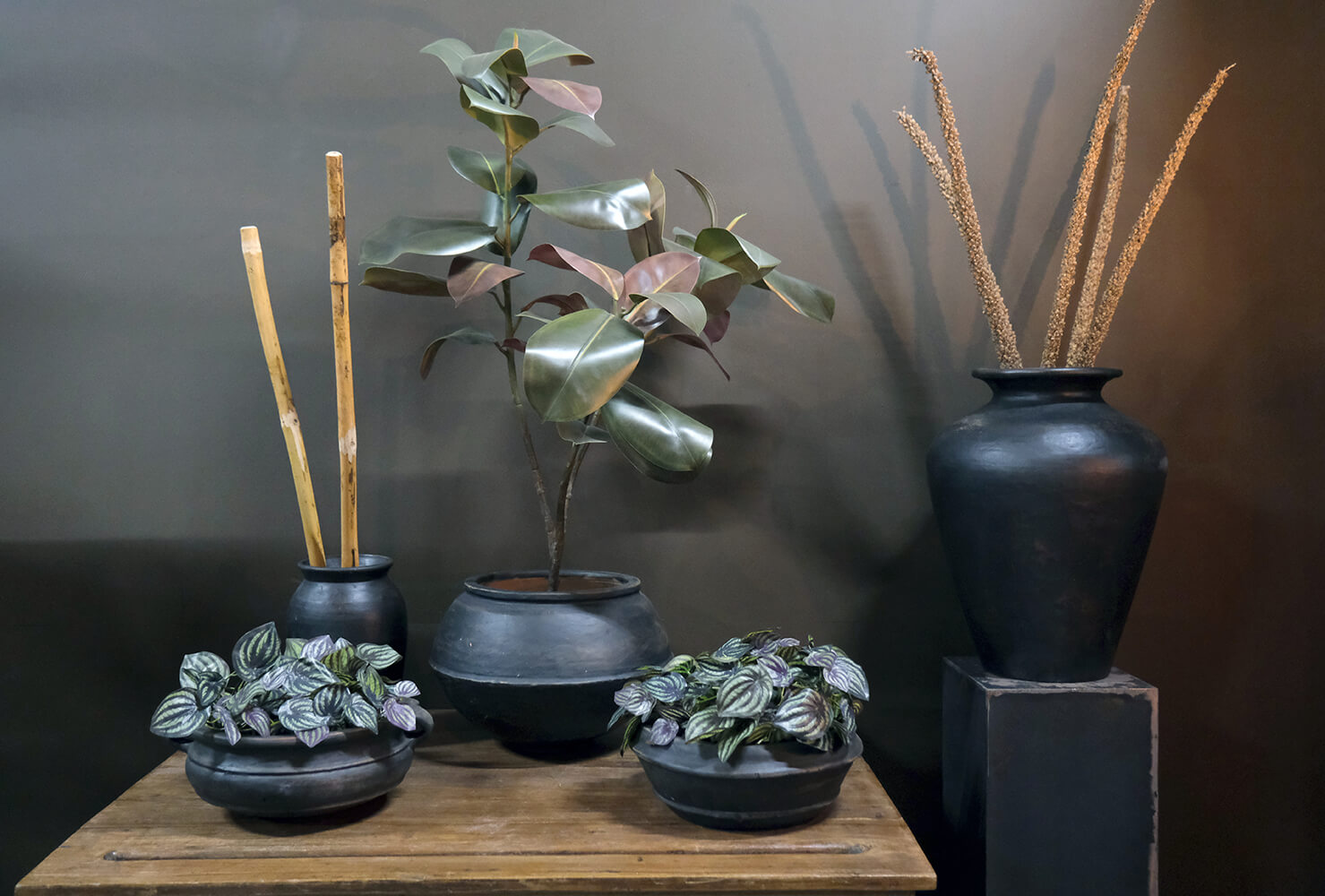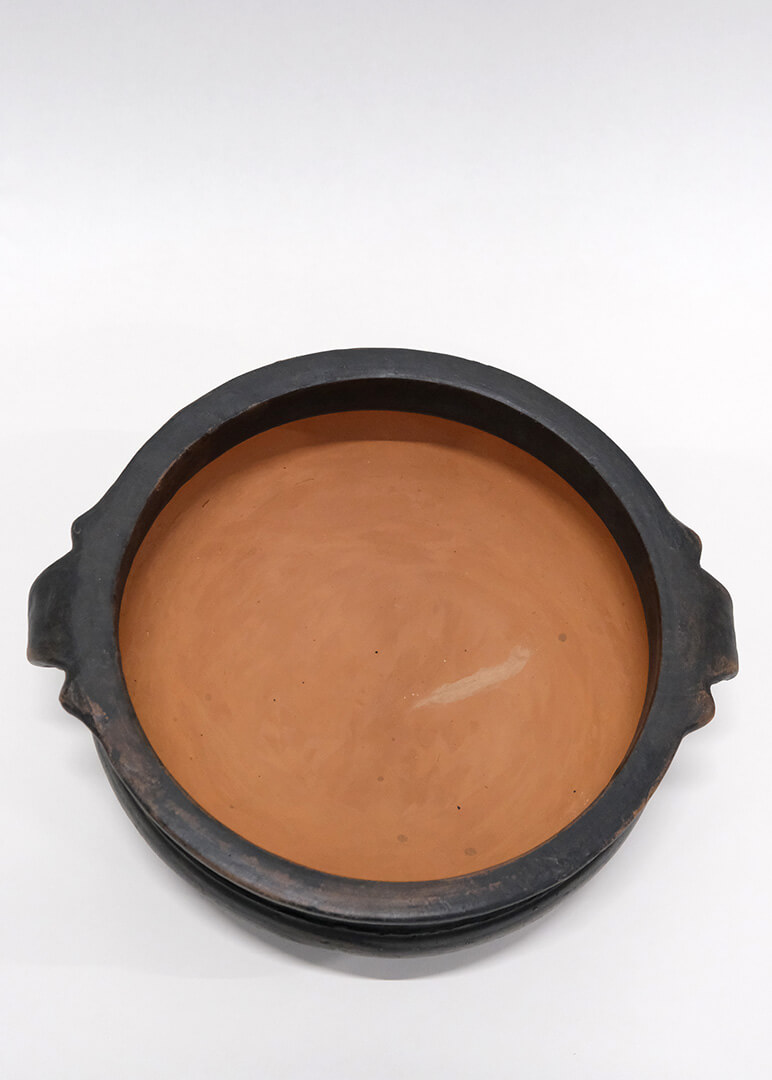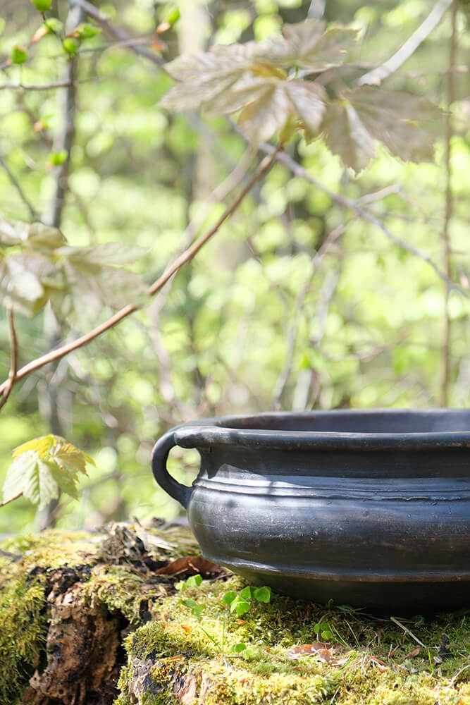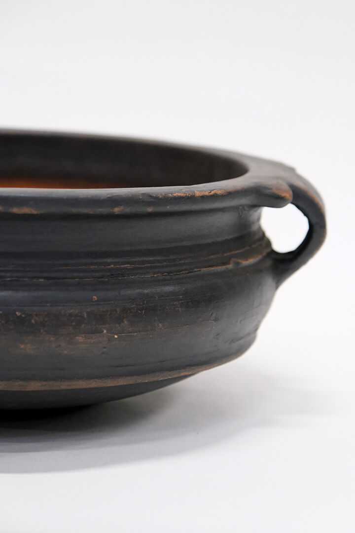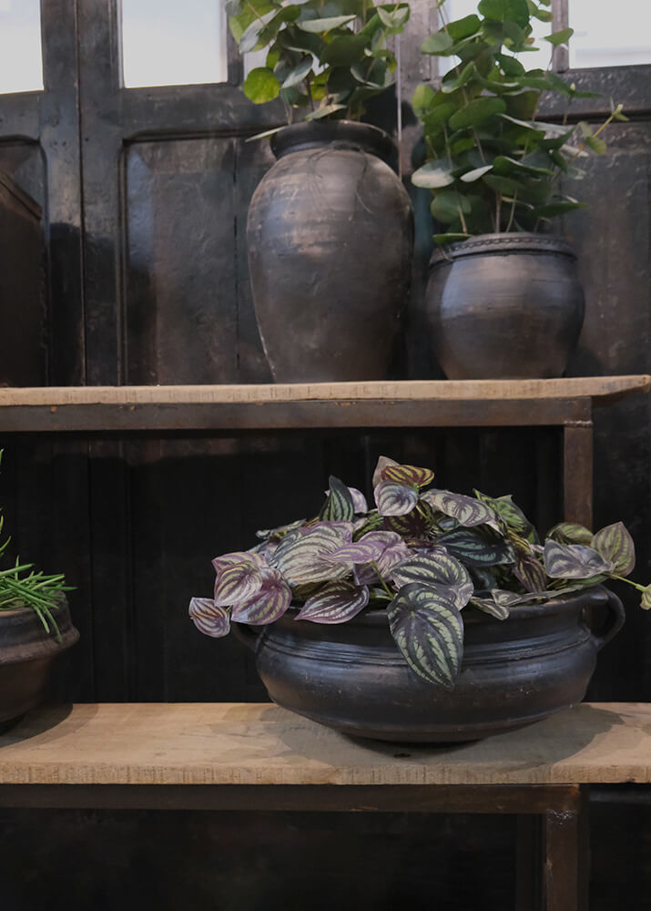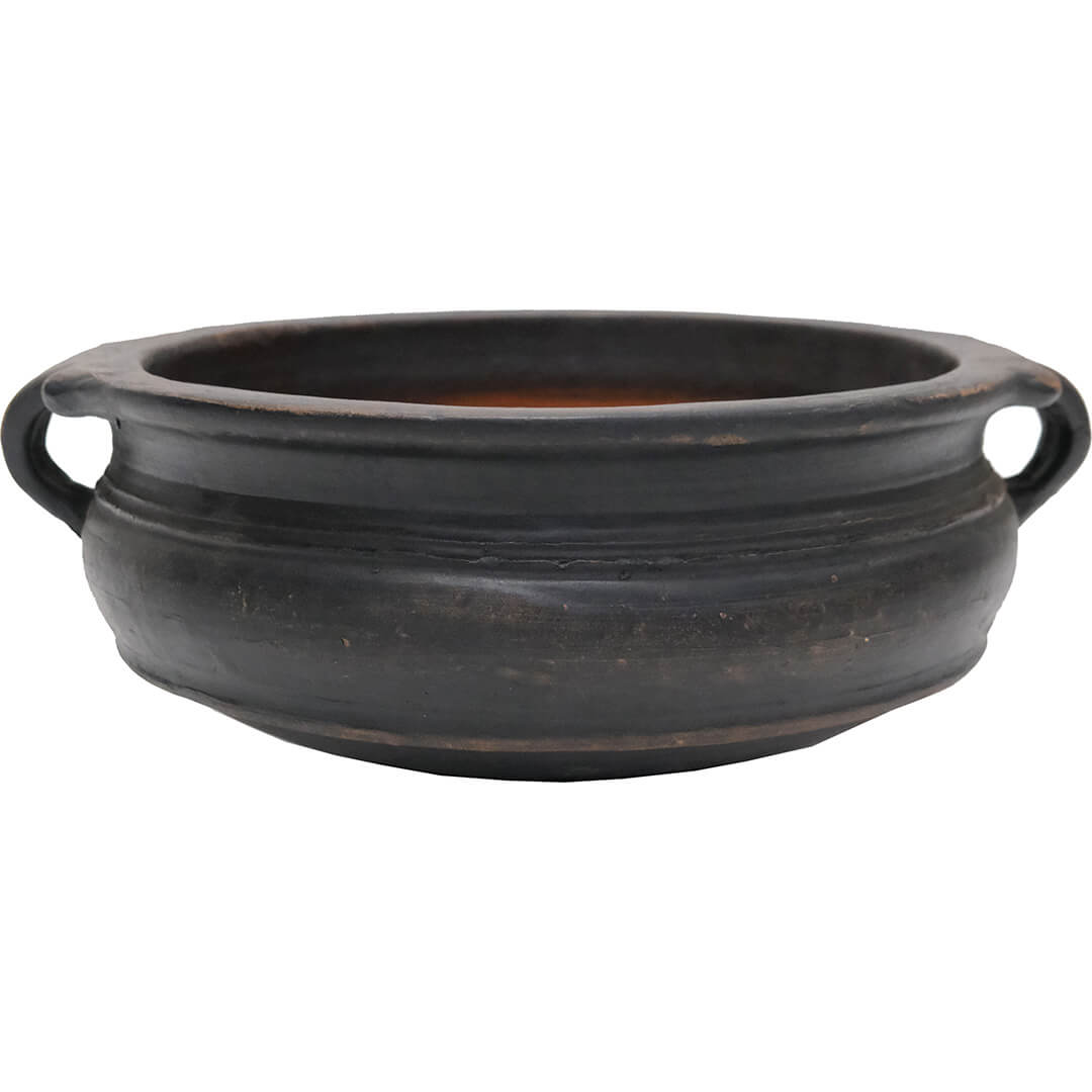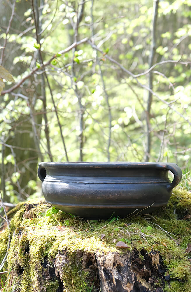 Skøn, håndlavet lerkrukke med ører. Krukken er mørk og har en flot patina, som stedvist lader lerets rødbrune farve komme til syne. Krukken er ikke vandtæt, så husk et plastikindlæg eller en glasindsats i bunden af krukken. H:15 cm x W:34 cm x D:40 cm