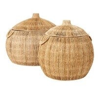 Malvina - buttet kurv med låg og håndtag - lille model str. H41 x D42 cm. Kurven er rummelig og har et eksotisk, men stramt udtryk der vil klæde en moderne indretning. Kurven er afstivet med metal og god til opbevaring af plaider, legetøj, garn mv.