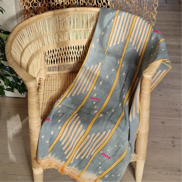 Unik vintagestof fra Afrika, håndvævet og indfarvet af Baule-folket fra Elfenbenskysten. Stoffet der er fremstillet i 100% bomuld og sammensat af lange smalle baner af håndvævet stof. Kan anvendes som et let plaid, eller sengetæppe samt dug på bordet. Mål ca. 105x155 cm. med frynser