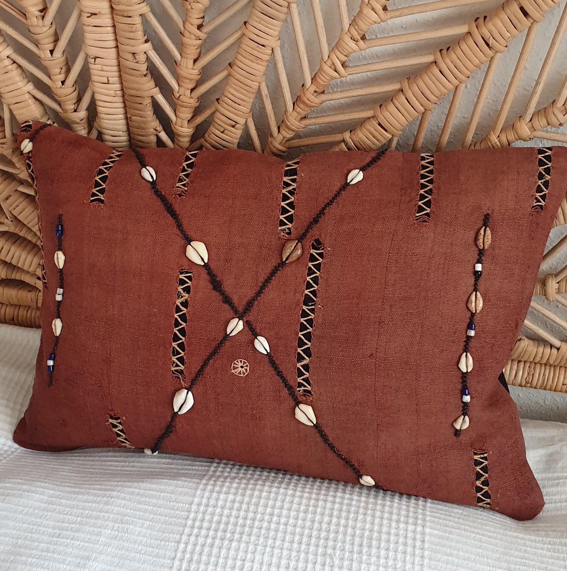 Kuba pude i rød raffia broderi og dekoration af skaller. Mål:35x50 cm. Puden er ny, men syet af vintage stoffer og der findes kun det ene eksemplar. De skønne stoffer er fremstillet efter traditionelle metoder, hvor godt håndværk og proces er vigtige ingredienser. Med en pude fra vores sortiment, er du sikret et unika produkt med sjæl og historie. OBS Vælg venligst inderpude i tilvalg.