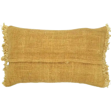 Smuk og enkel pude i vævet bomuld med broderi, farven er sart gul med frynser og hvide håndsyede sting. Størrelsen er 30x50 cm. Puden på Bali og har monteret lynlås.