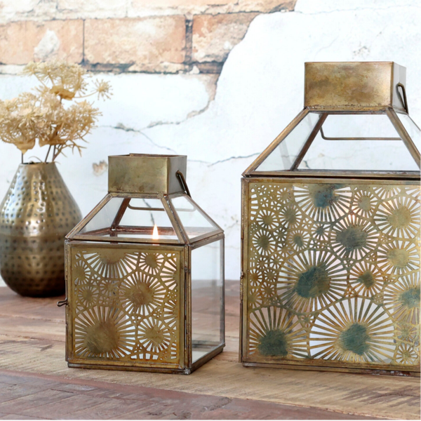 Firkantet lanterne i antik messing fra Chic Antique. Lanternen har et fint mønster som spreder lyset på smukkeste vis. lanternen måler H17/L10/B10 cm