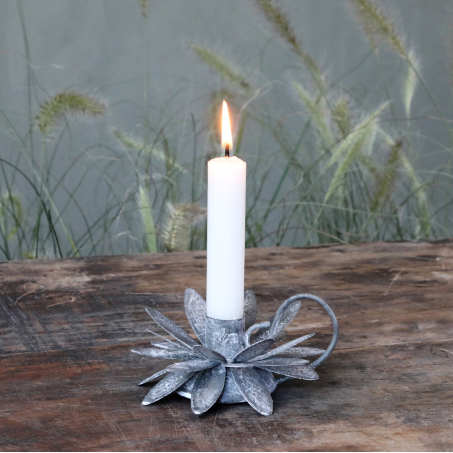 Fin lille kammerstage til bedelys, formet som en blomst i jern med antique zink finish. Stagen der er fra Chic Antique måler H6/L12/B11 cm.
