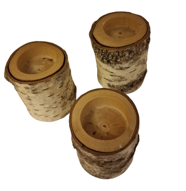 Smukke fyrfadsstager skåret i ægte birketræ. Sat bestende af tre forskellige størrelser