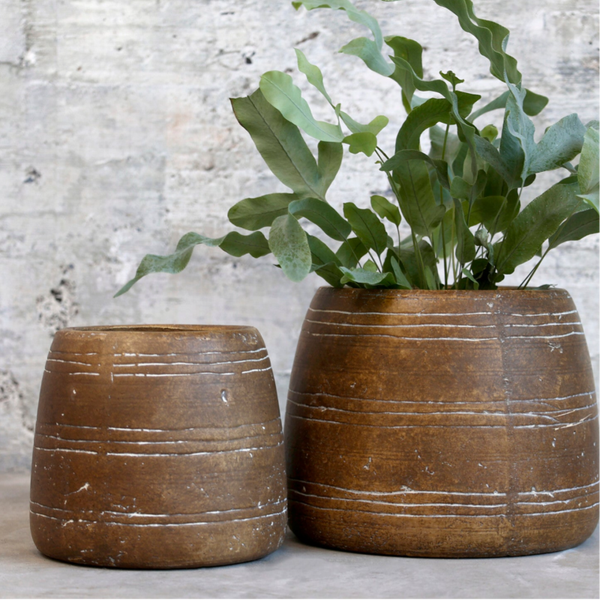 Rustik potteskjuler med brun glasur og riller fra Chic Antique. Skjuleren måler H14 x Ø17cm.