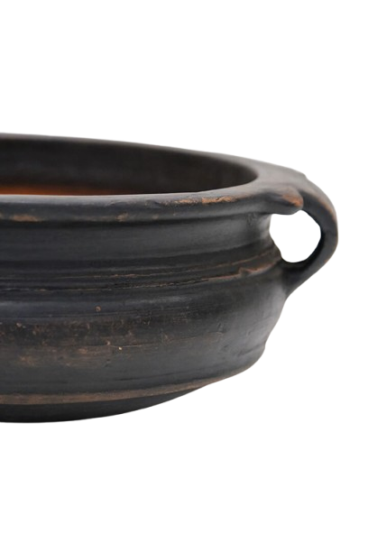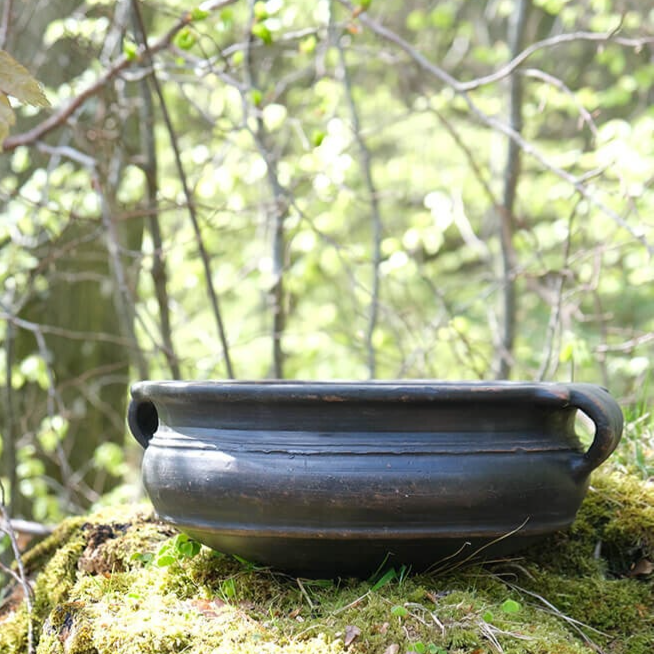 Skøn, håndlavet lerkrukke med ører. Krukken er mørk og har en flot patina, som stedvist lader lerets rødbrune farve komme til syne. Krukken er ikke vandtæt, så husk et plastikindlæg eller en glasindsats i bunden af krukken. H:15 cm x W:34 cm x D:40 cm