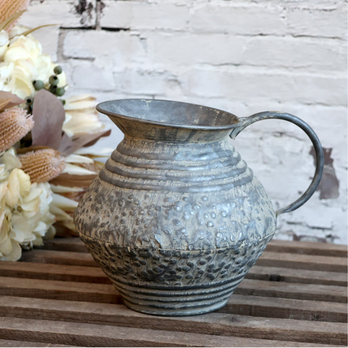 Smuk dekorativ kande i jern med antik zink finish. Kanden har et rustikt udtryk der passer fint til terassen, haven eller lignende. Den er dog ikke vandtæt, men god til tørrede blomster, grene eller med et indsats i plast.