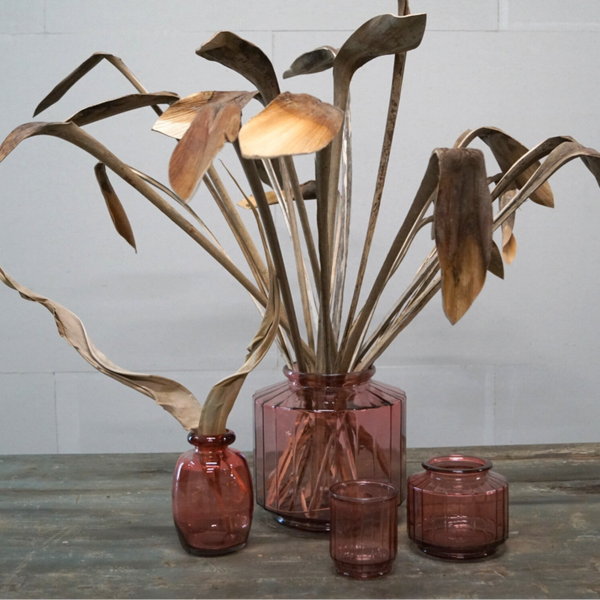 Lav vase i rosa genbrugsglas med en sjov kantet form. Vasen måler H:12 cm x D:14 cm. Vasen fåes også i grøn