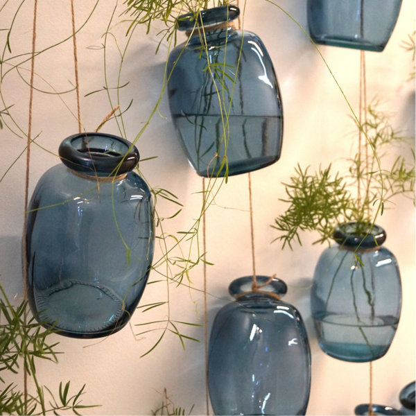 Flot blå glasvase lavet af genbrugsglas. Kan anvendes til både blomster og grene eller som dekoration i sig selv og i grupper. Måler H:15 cm x D:10 cm