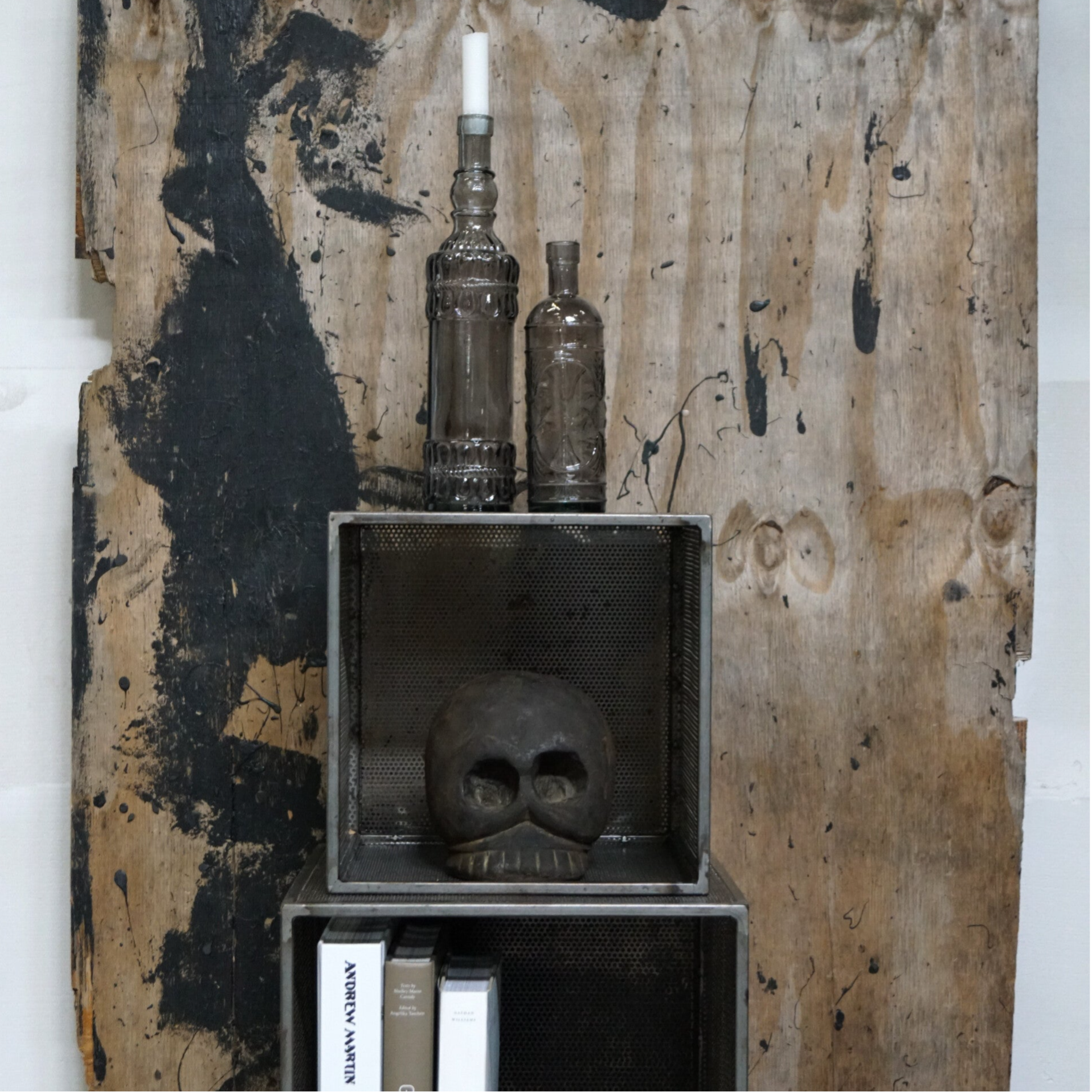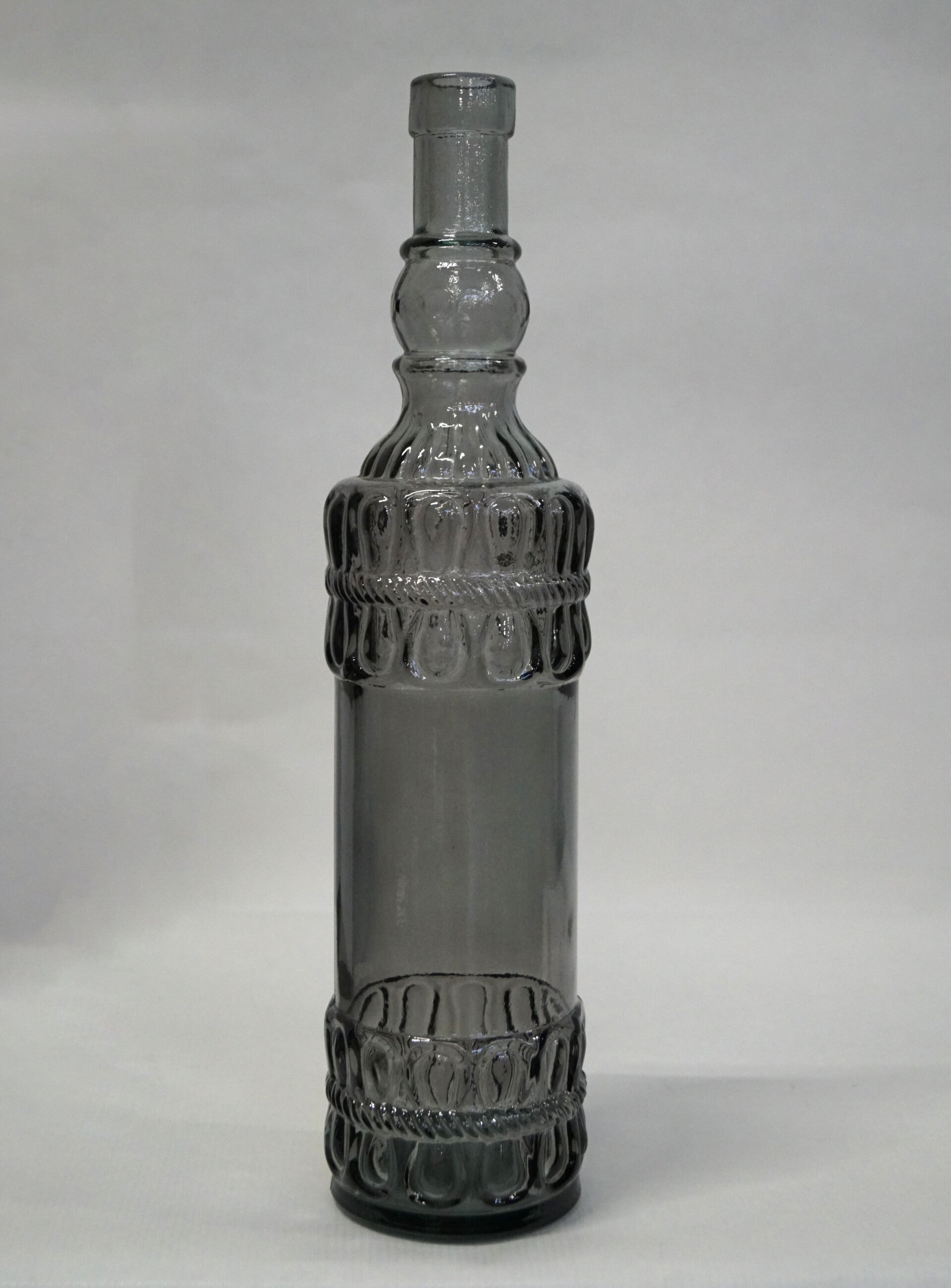 Smuk glasflaske i grå med mønster og korkprop.str. H:33 cm x D:7,5 cm Brug den som dekoration i en gruppe med andre flasker, som enkel vase eller lysestage.