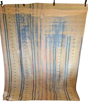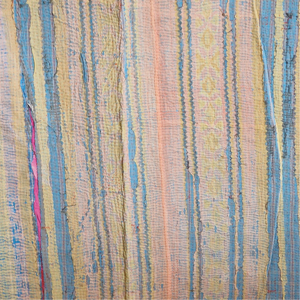 Kantha quilt plaid i skønne pastelfarver af blå gul og orange. Plaiden er sammensat af brugte Indiske sarier så de to sider er forskellige, og efterfølgende syet med de karakteristiske kantha sting. Denne plaid har en smuk patina, da stoffet er bleget efter lang tids brug.