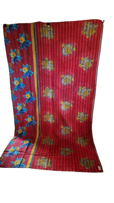 Katha quilt plaid fra Indien. Plaiden er sammensat af brugte Indiske sarier så de to sider er forskellige, og efterfølgende syet med de karakteristiske kantha sting. Denne plaid er lavet af stof i sprudlende stærke farver. Den er ikke sømmet i enderne.