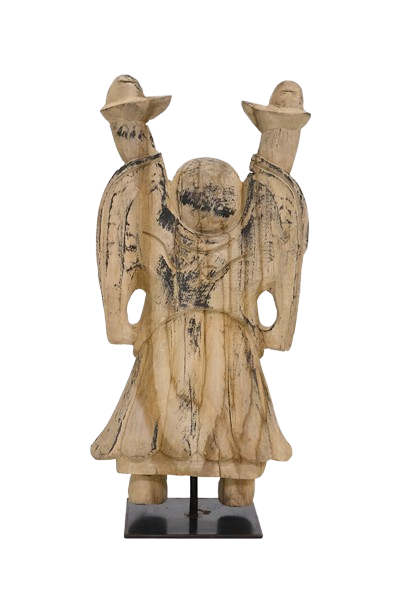 Flot håndlavet Happy Buddha figur i træ. Et fint stykke håndværk der vil sprede glæde i hjemmet. Figuren står på en jernfod og måler H:33 cm x B:15 cm x D:10 cm