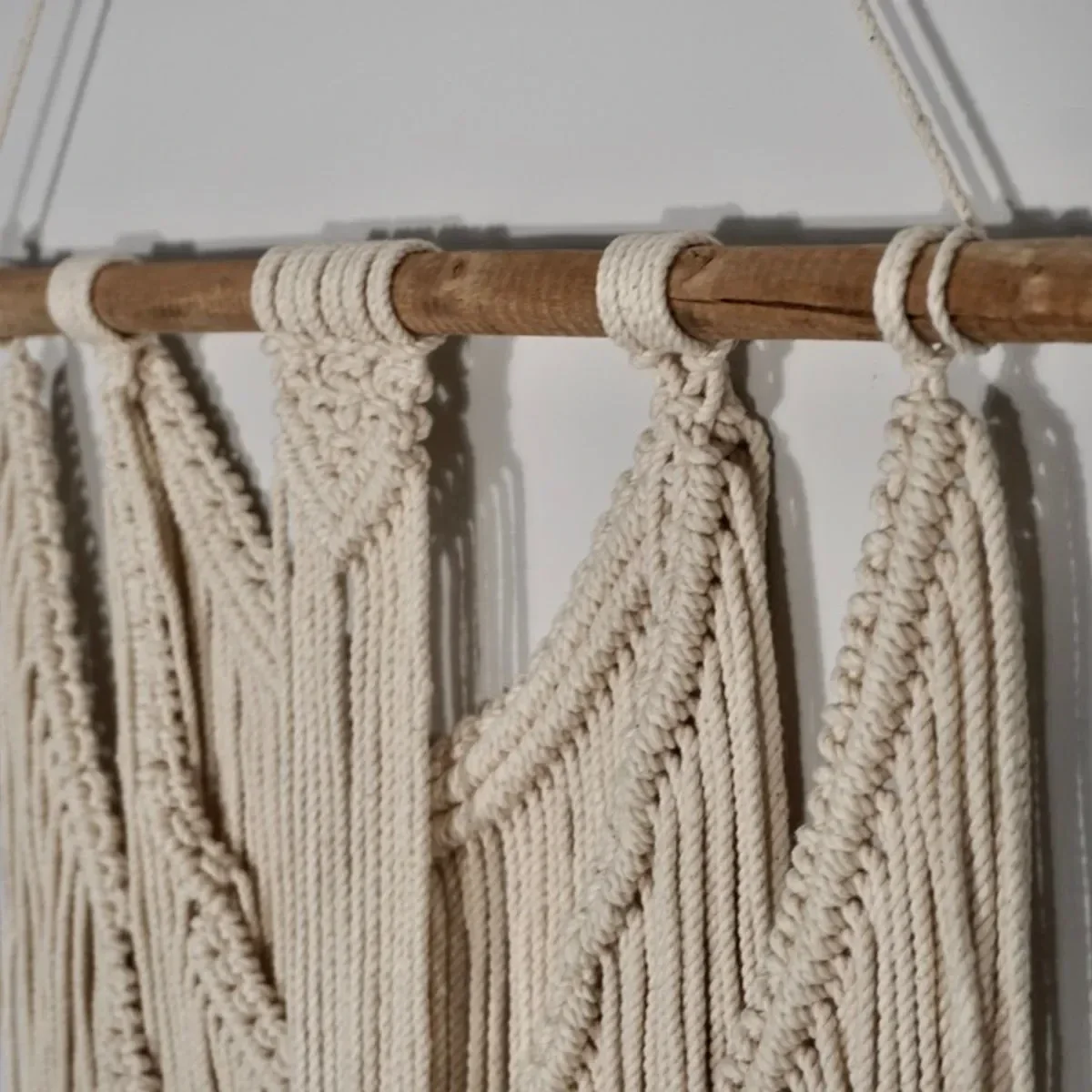 Smukt makramé i bohémestil - håndknyttet vægtæppe i cremefarvet bomuld snor. Bruges til ophæng på væg eller i vindue/dør. Monteret på rund stang og lige til at hænge op. Mål 54cm x 84cm