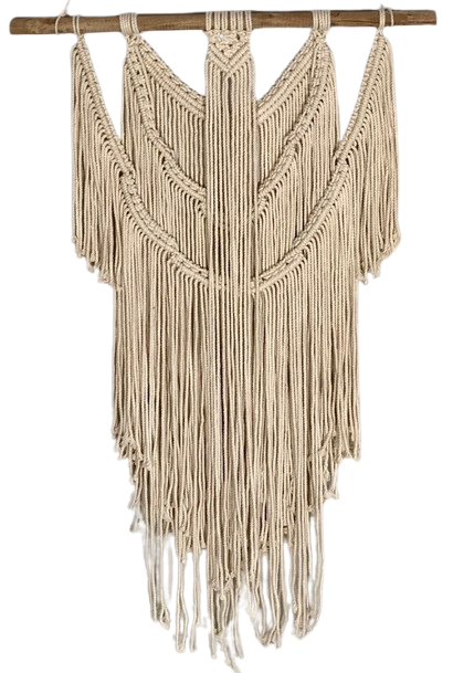 Makramé er en ældgammel håndabejdsform der kan spores tilbage til babylonerne. Den havde sin største udbredelse i den Victorianske periode men kendes især for sin popularitet i 1970´erne, hvor den sættes i forbindelse med hippiernes bohemeindretning. Makramè har fået et comeback inden for de sidste par år. Stilen er ægte Bohéme, disse vægtæpper vil også klæde en moderne indretning.