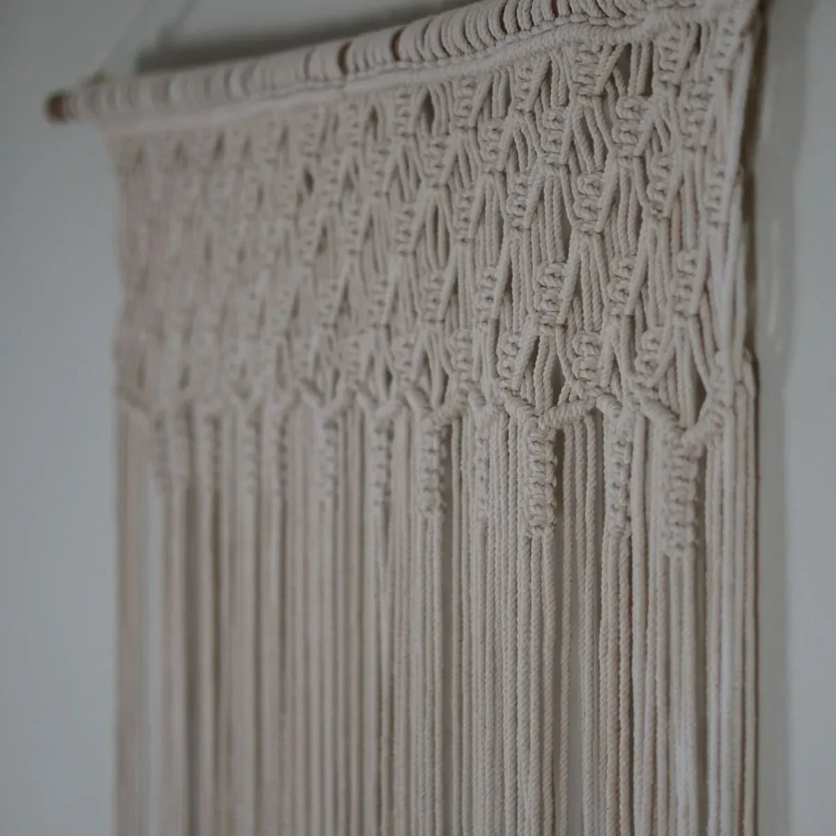 Smukt makramé i bohémestil - håndknyttet vægtæppe i cremefarvet bomuld snor. Bruges til ophæng på væg eller i vindue/dør. Monteret på rund stang og lige til at hænge op. Mål 90cm x 96cm