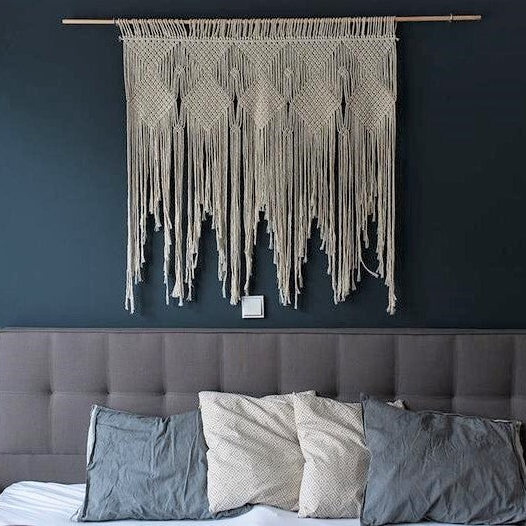 Makramé er en ældgammel håndabejdsform der kan spores tilbage til babylonerne. Den havde sin største udbredelse i den Victorianske periode men kendes især for sin popularitet i 1970´erne, hvor den sættes i forbindelse med hippiernes bohemeindretning. Makramè har fået et comeback inden for de sidste par år. Stilen er ægte Bohéme, disse vægtæpper vil også klæde en moderne indretning.