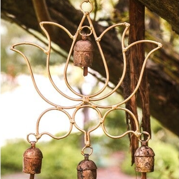 Vindspil Lotusblomst i metal med 4 klokker. Anvendes inde eller ude, f.eks i et vindue, på altan eller terrasse, hvorfra man kan nyde den smukke klang fra klokkerne. måler ca. h25xb19cm. Vindspillene er fremstillet i Indien af genbrugsmetal og lakeret for at beskytte mod rust.