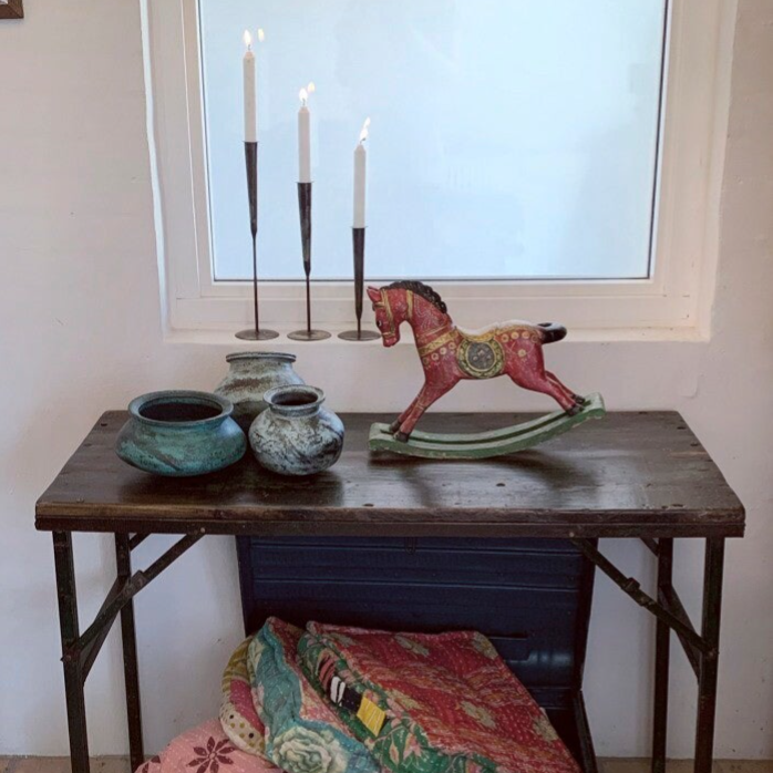 Skøn lille gyngehest i træ med smuk bemaling. Fremstillet i Indien. OBS de er alle forskellige i udtryk og kan variere i.f.t. billeder - Farve rød. str. L37cm, D9cm & H30cm