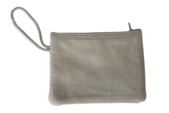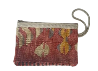 Lille pung i kelimstof, med lynlås og håndledsdnor i nylon. Måler ca. 13x18cm