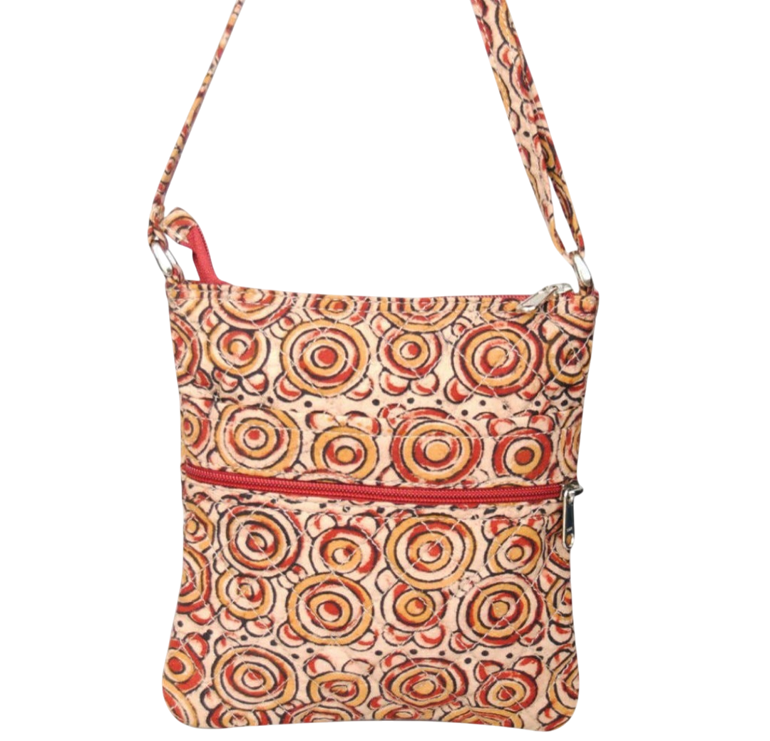 Smuk lille skuldertaske til daglig brug. Tasken har to udvendige lommer med lynlås og en indvendig. Skulderremmen kan justeres i længde. Fremstiilet i Indien af bomuldsstof. Størrelse 21x18cm.
