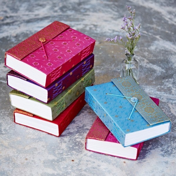 Vores smukke Sari-indbundne notesbøger fås i flere størrelser og farver. Notesbogen har en størrelse der gør den velegnet som dagbog, rejsedagbog, inspirationsbog eller almindelig notesbog.Hver bog er håndlavet og indeholder 125 sider uforet khadda-papir. Khadda papir er lavet af genbrugsbomuld, er syrefrit og er et smukt papir at skrive eller tegne på. Hver journal er unik - nogle kan komme med et stænk af kronblade på siderne og nogle med off-white papir.Mål: 15x11cm