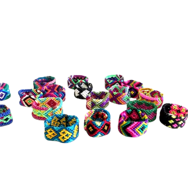 Fine fingerringe knyttet i smukke farvekombinationer. ringene er fremstillet i Mexico af Mayakvinder og er et fairtradeprodukt. Traditionalt gives ringene i gave til familie og venner, som man besøger. Giv det til en du holder af og støt fattige kvinders vilkår i Mexico. OBS de er ret store i størrelsen.