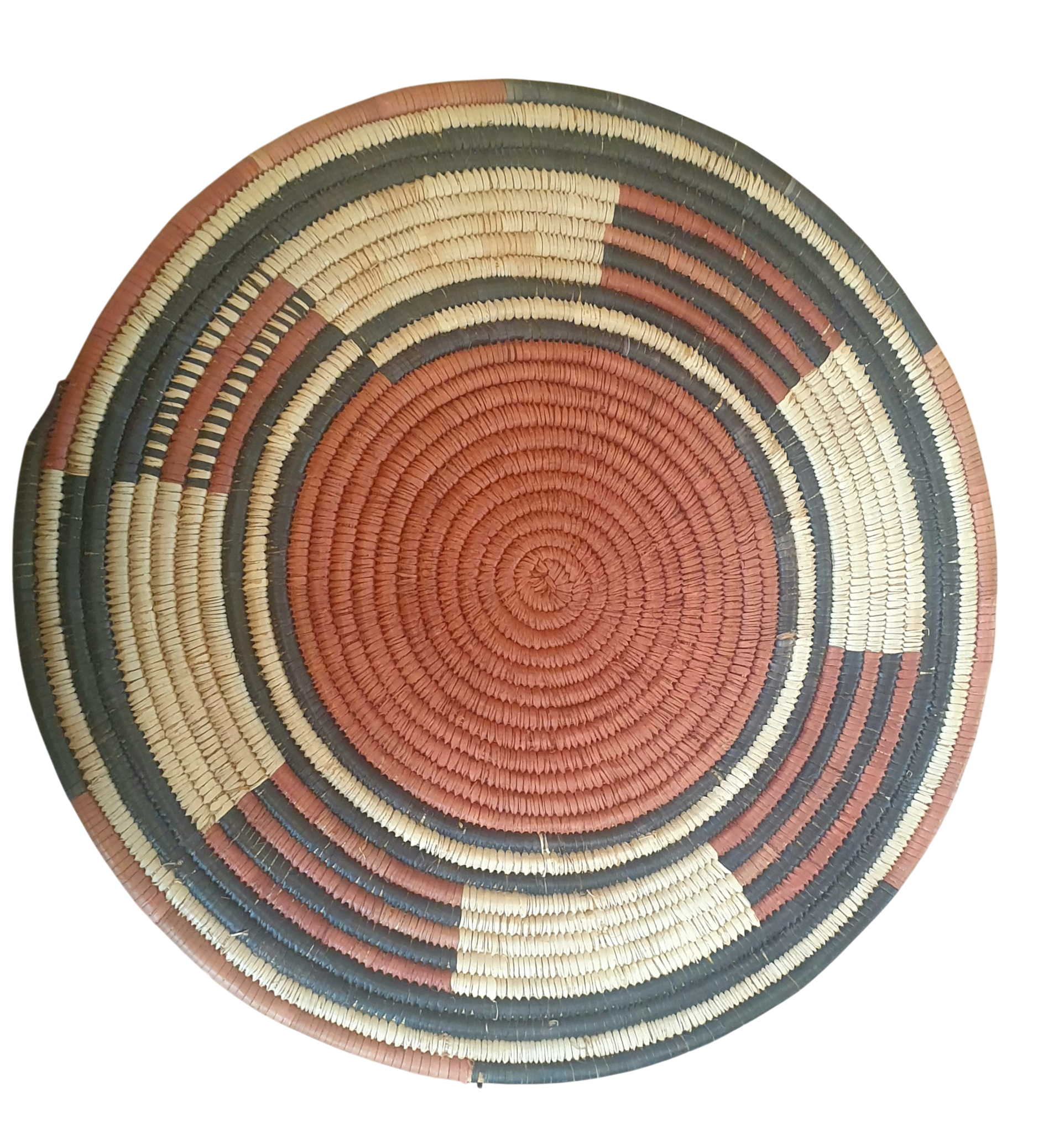 Smukke håndflettede dækkeservietter fra Ghana med mønster i sort, rød og natur. Dækkerservietterne kan også bruges som bordskåner eller dekoration, f.eks. på væg sammen med andre flettede kurve. De måler 35-40 cm og der er naturlige variationer og farver og mønstre.