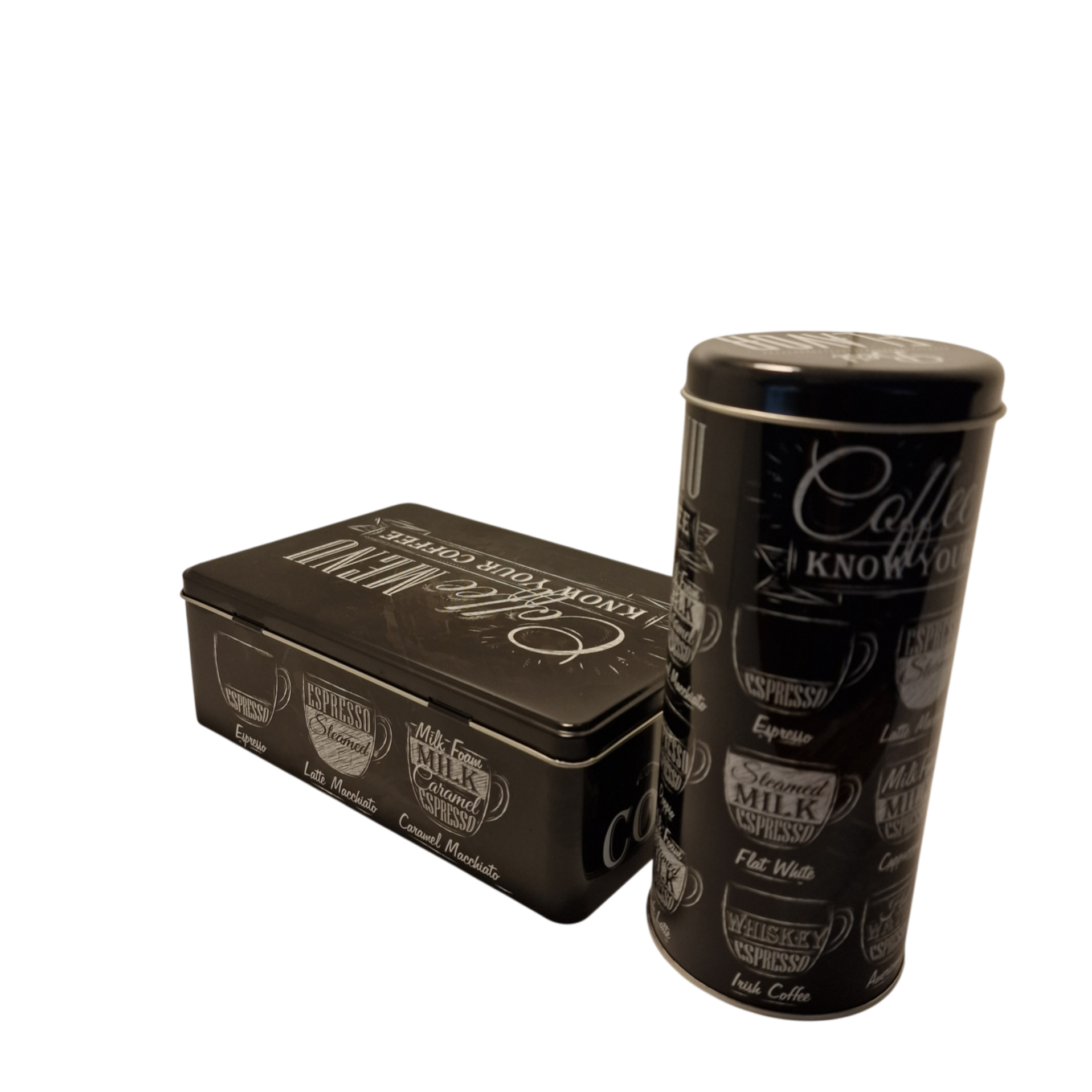 Sæt á to metaldåser - en madbox og en kiksebox - begge dekoreret i retrostil med kaffemotiver og tekst.