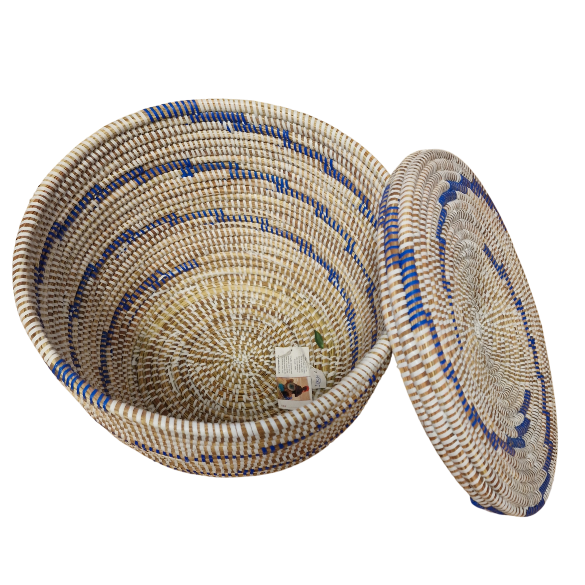 MARIAME BA -Flettet Kurv med låg - solig og fast fremstillet i Senegal af strå og plast. Fås i assorterede farver/mønstre - Sælges normalt som sæt á 3 - Denne her er på lager 1 stk