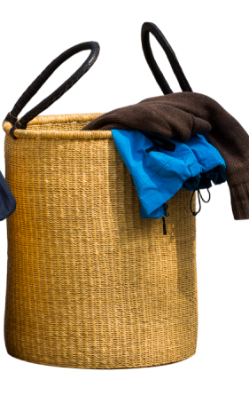 Skønne håndflettede kurve fra Hammershus Fairtrade - produceret i Ghana - her med hanke i sort læder -Mellemste H50 x D43 cm.