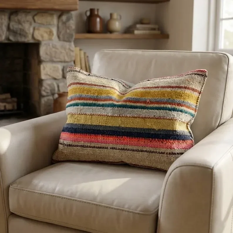 Alle vores kelim puder er håndplukkede med fokus på kvalitet og findes kun i et eksemplar. Da materialerne er brugte tæpper, kan der forekomme brugsspor i form af lettere slid eller falmede farver og pletter. Tæpperne er rensede før brug i pudeproduktionen.