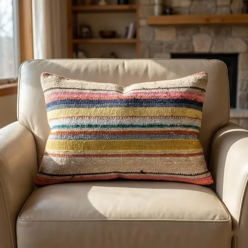 Alle vores kelim puder er håndplukkede med fokus på kvalitet og findes kun i et eksemplar. Da materialerne er brugte tæpper, kan der forekomme brugsspor i form af lettere slid eller falmede farver og pletter. Tæpperne er rensede før brug i pudeproduktionen.