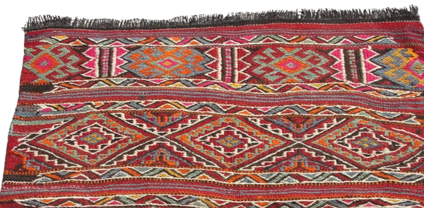 Smukt tyrkisk tæppe i røde farver og traditionelle geometriske mønstre i grøn, orange, blå og hvid.Tæppet er fremstillet i 100% uld og er kraftig i kvaliteten. Velegnet til ophæng på væg eller som lille måtte i entre, sovaværelse eller bad. Mål 85cmx96cm