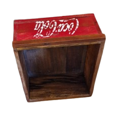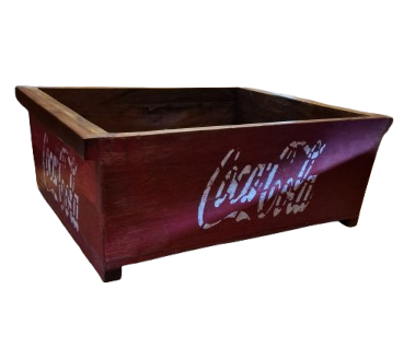 Rustik trækasse i mørk træ malet rød med Coca-cola logo udvendig. Måler 37x45x18cm og er fremstillet i gedigen kvalitet. Fed til opbevaring, feks. i køkken eller bryggers osv.